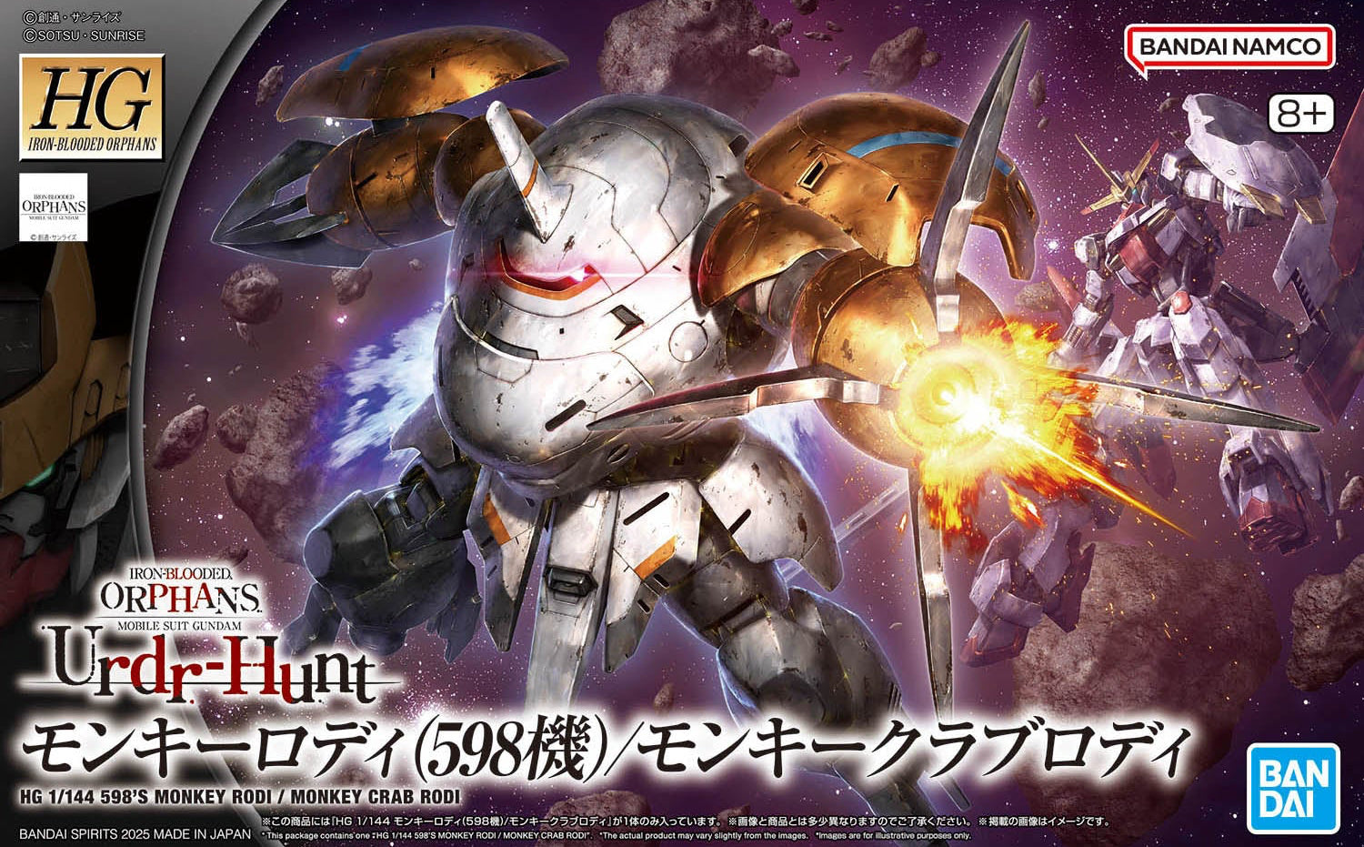 From Mobile Suit Gundam: Iron-Blooded Orphans Urdr-Hunt, the Monkey Rodi (Unit 598) joins the HG 1/144 line. By swapping included parts, the kit can also be assembled as the Monkey Crab Rodi, recreating both configurations seen in the series. Built on the rounded Rodi Frame, it features flexible articulation and a full loadout including a crowbar, submachine gun, shield, and grenades. Grenades can be mounted on the side armour or held with a dedicated right-hand part, adding display variety.
